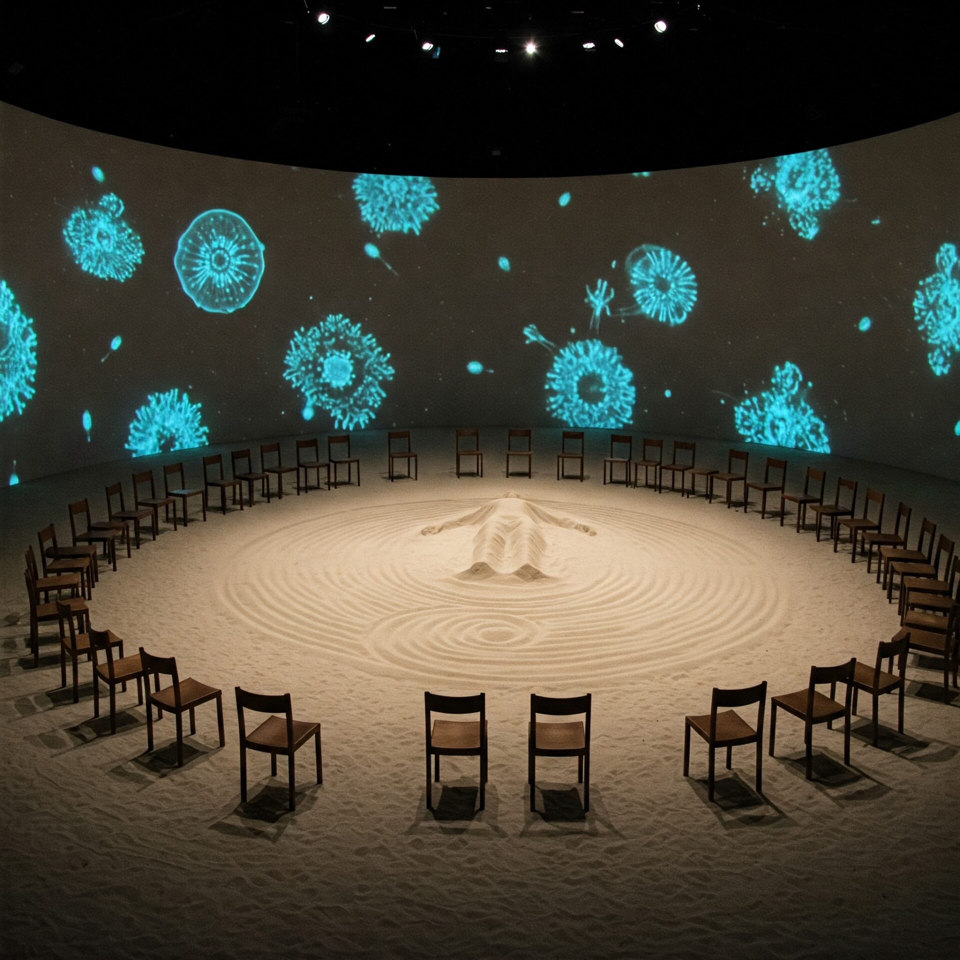 The work offers a deep-sea journey through a spatialized soundscape—inspired by the folk music of Iceland, Sardinia, and other islands—combined with animated projections of marine micro-life. The experience is further enriched by poetry from the featured islands. Premiering at VAF 2026.